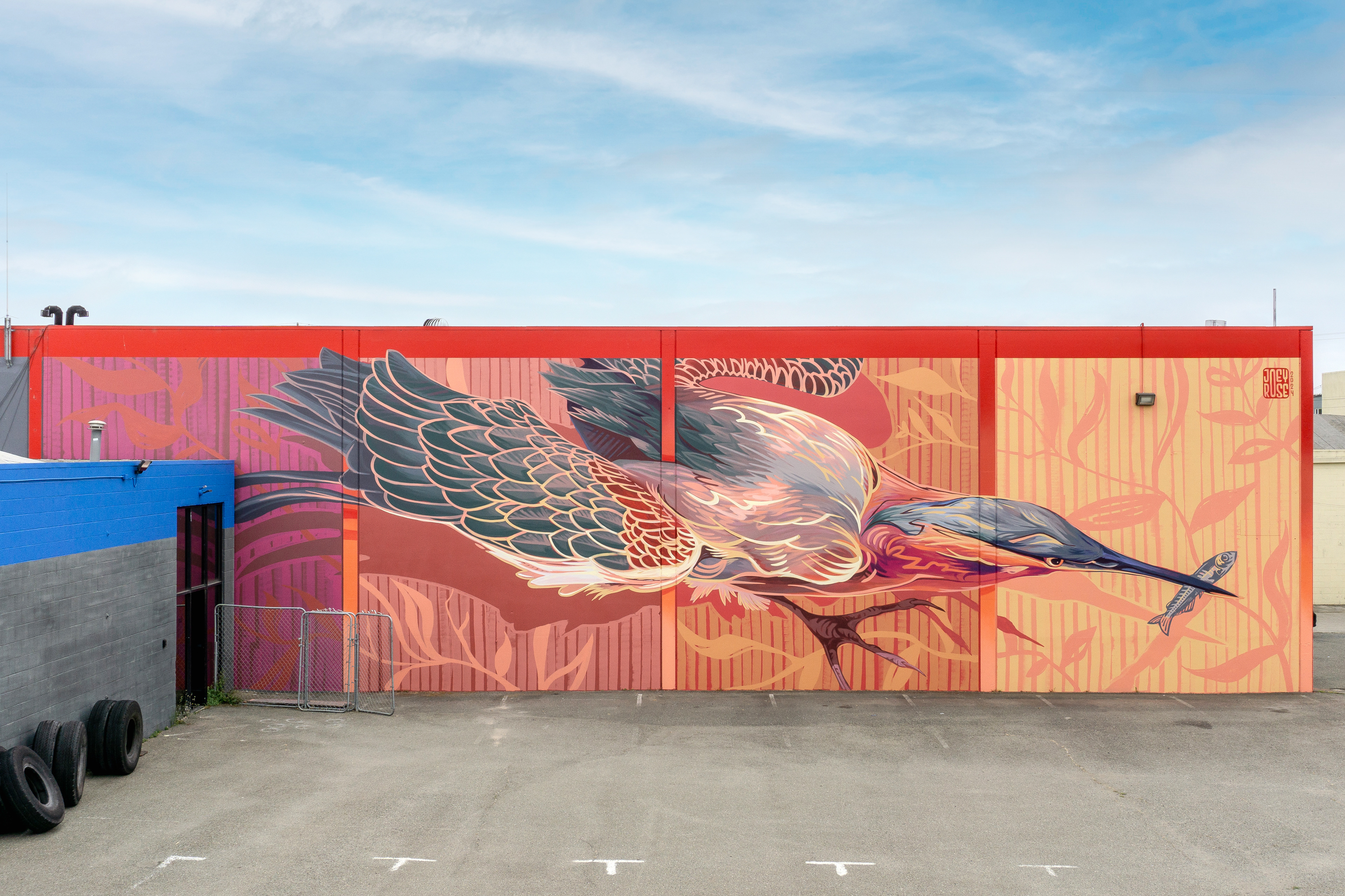 Emeryville Visual Arts Grant Recipient. This mural features a green heron and the delta smelt: a keystone species.